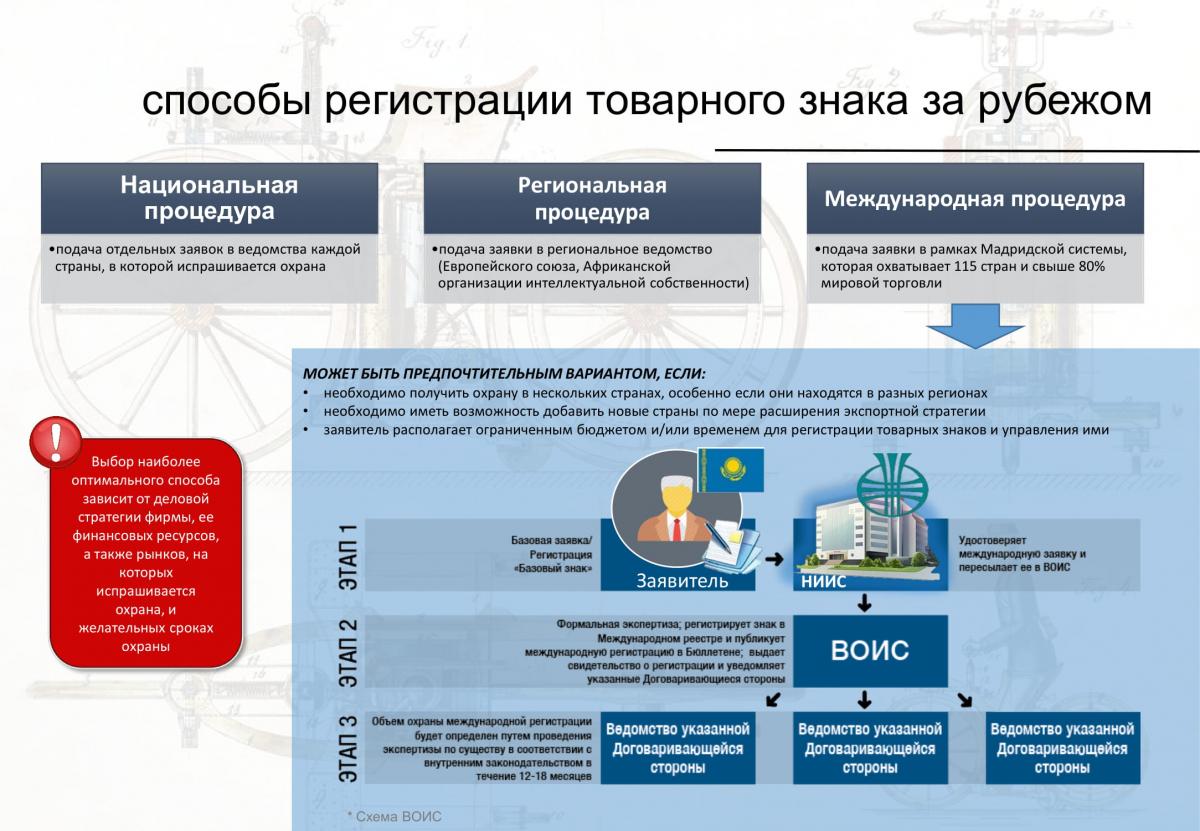 The international registration of trademarks is carried out in accordance with the Protocol to the Madrid Agreement on International Registration of Marks of 27 June 1989. (hereinafter - Protocol). The protocol provides for the submission to the authority of origin (in the Republic of Kazakhstan - RGP "National Intellectual Property Institute" (hereinafter - NIIP) of an international application containing the countries and/ or international organizations (hereinafter - countries) that have signed the protocol. The current list of members is available on the website of the World Intellectual Property Organization (hereinafter - WIPO) https://www.wipo.int/web/madrid-system/members/index. If the international registration procedure is successfully completed, the trademark shall be recognized as being registered in the countries specified in the international application as if the application had been submitted directly to the authorities of those countries.