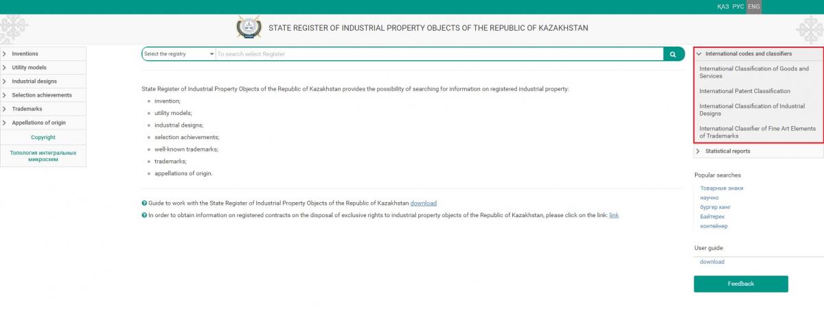2. On the main page https://gosreestr.kazpatent.kz/, in the section “International codes and classifiers” there is a subsection “International patent classification”.