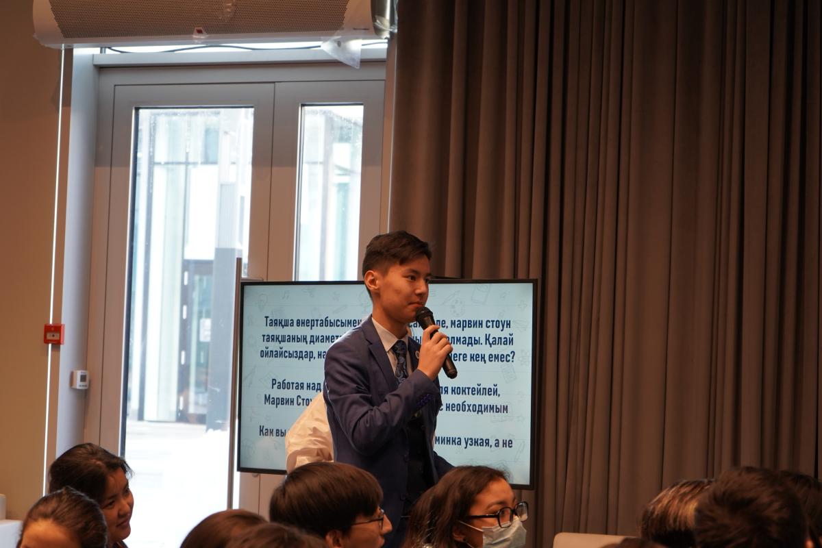 Pupils had the opportunity to talk with their peer - inventor, author of a utility model patent No. 4495 “Dome-shaped solar tracker”, a student of 11 grade, No. 9 “ZERDE” Specialized School, Temirlan Rakhimbayev, who shared his experience of invention, answered questions from the audience.