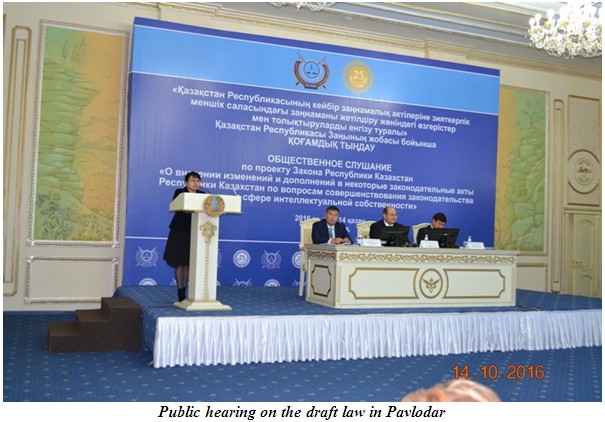 On October 14, 2016 Public hearing on the draft law of the Republic of Kazakhstan “On amendments and supplements to some legislative acts in the field of intellectual property” was held in Pavlodar organized by the Ministry of Justice of the Republic of Kazakhstan.