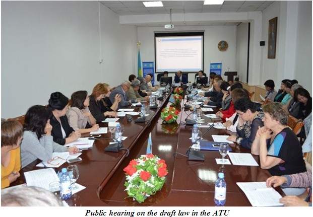 On September 30, 2016 at 10.00 in Almaty Technological University Public hearing on the draft law of the Republic of Kazakhstan “On amendments and supplements to some legislative acts on legislation improvement in the field of intellectual property” (hereinafter – draft law) was held with the participation of representatives of the Ministry of Justice, RSE “National Institute of Intellectual Property” (hereinafter – RSE “NIIP” of MJ of RK) and academic teaching staff of the university.