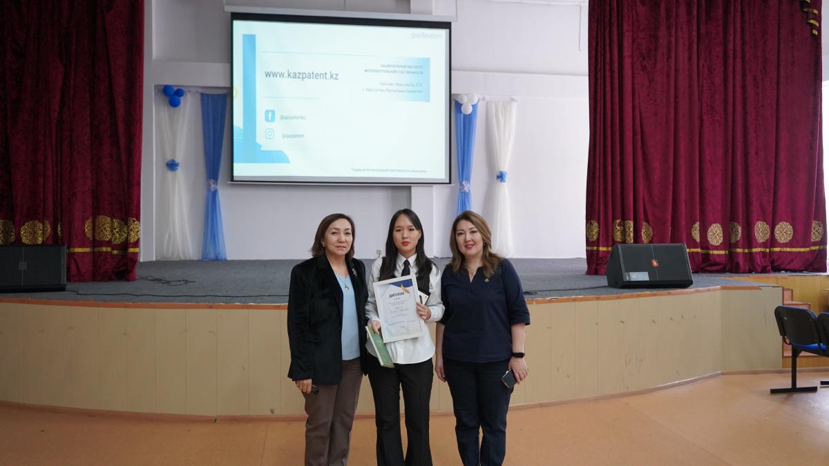 Оқушылар алдында зияткерлік меншік құқығы орталығының (IPR Center) басшысы Алтын Сапарғали және даму және халықаралық ынтымақтастық басқармасының басшысы Инкара Шертышева сөз сөйледі.