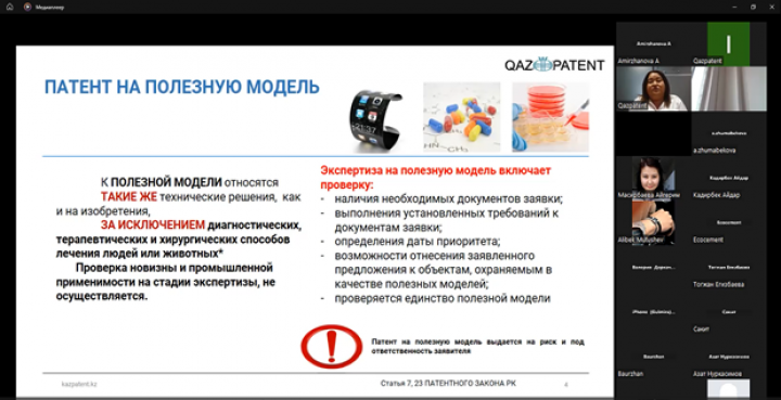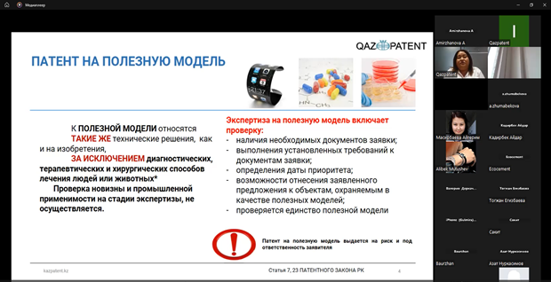 The webinar covered the issues of existing legislation in the field of intellectual property, patenting of inventions and utility models, claims for inventions and utility models, patent information search, as well as state registers of industrial property of the Republic of Kazakhstan.