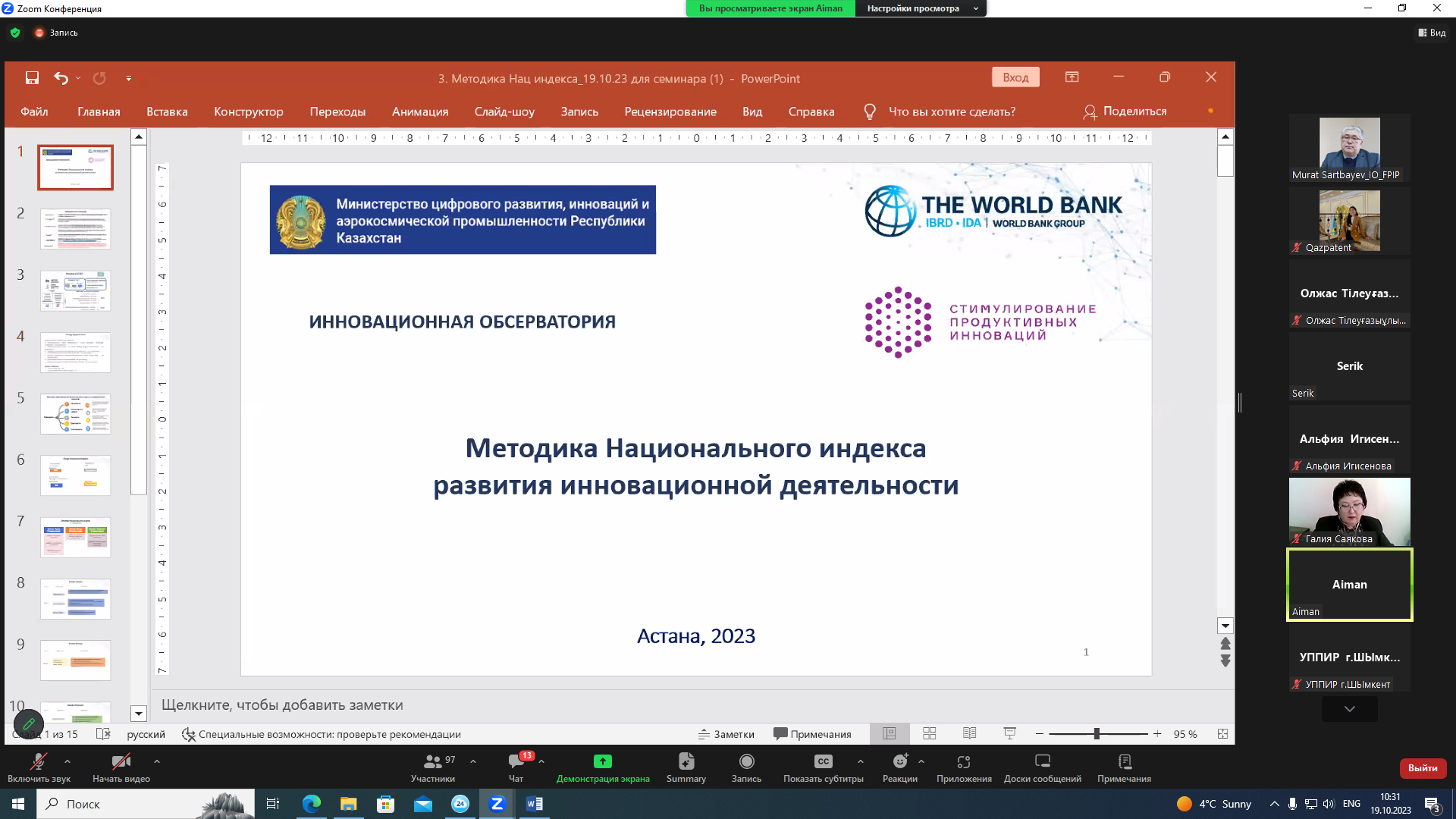 On October 19, at 10:00, Ministry of Digital Development, Innovation and Aerospace Industry of the Republic of Kazakhstan together with the Innovation Observatory of the project "Fostering Productive Innovations", JSC "National Agency for the Development of Innovations "QazInnovations" organized a webinar on "Stimulating innovation activity in the regions". The webinar was aimed at informing the participants of the regional innovation ecosystem about the work on the development of technologies and innovations in the Republic of Kazakhstan.
