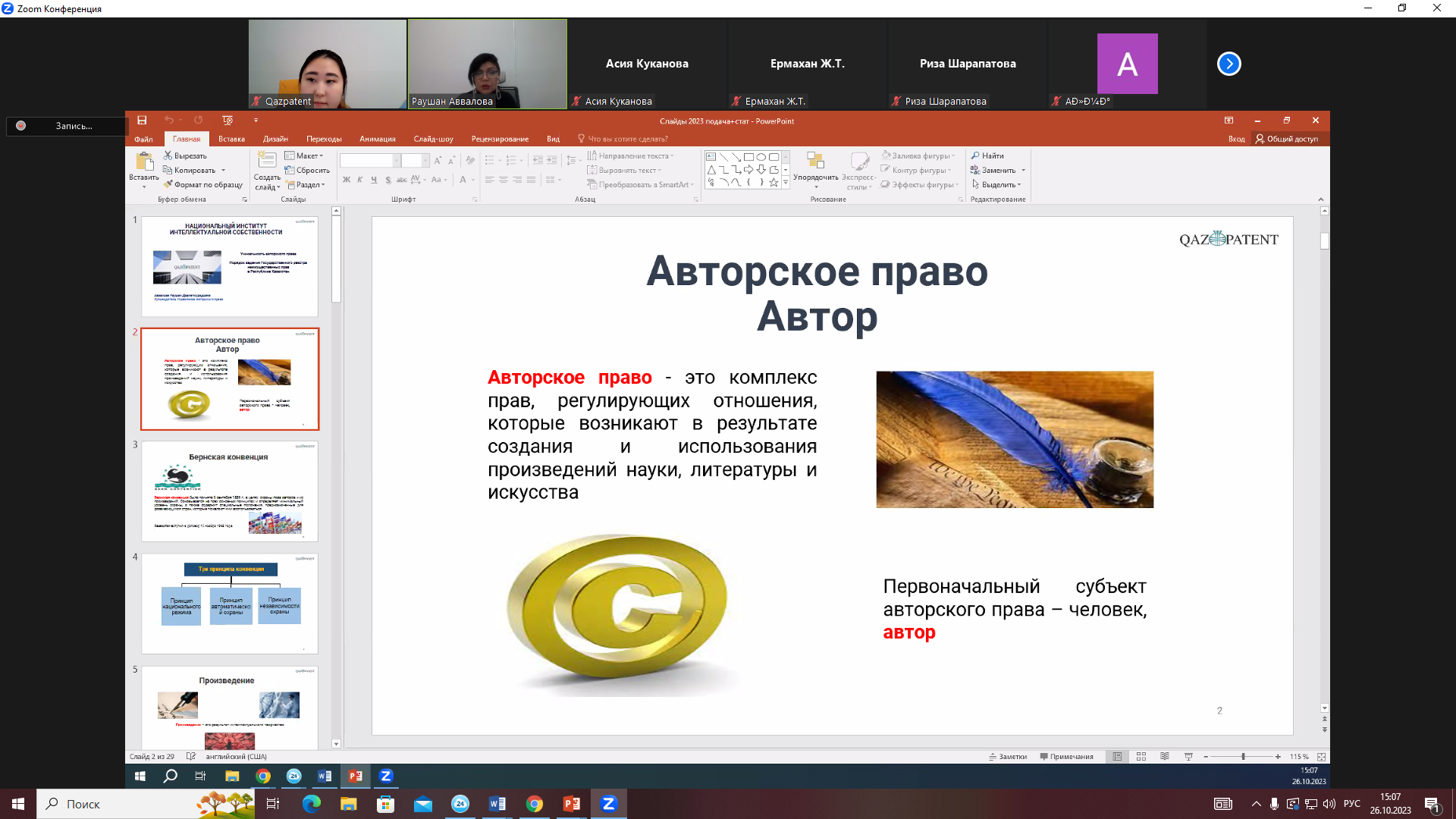 Within the framework of the webinar, issues of copyright in Kazakhstan and in the world, registration of copyright for own works, as well as issues of patenting inventions and utility models were discussed.