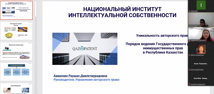 Within the framework of the webinar, issues of copyright registration for own work in the Republic of Kazakhstan, as well as patenting of inventions and utility models.