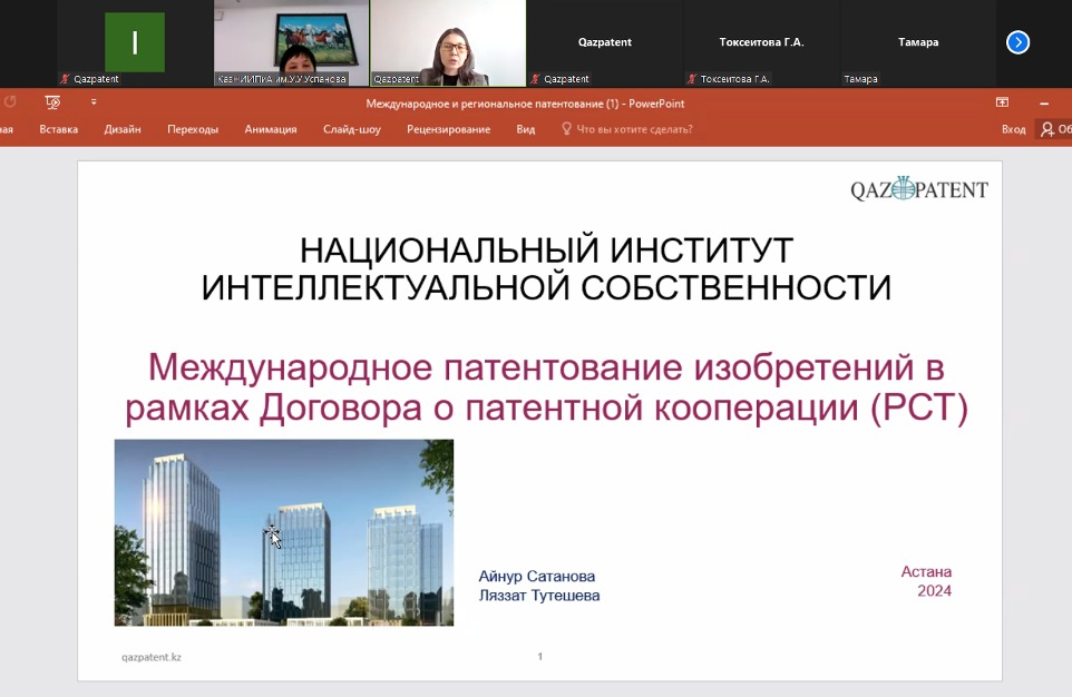Within the framework of the webinar, issues of copyright in the Republic of Kazakhstan and in the world, patenting of inventions and utility models, international patenting of inventions in accordance with the Patent Cooperation Treaty (PCT), as well as issues of regional patenting of inventions in accordance with the Eurasian Patent Convention were discussed.
