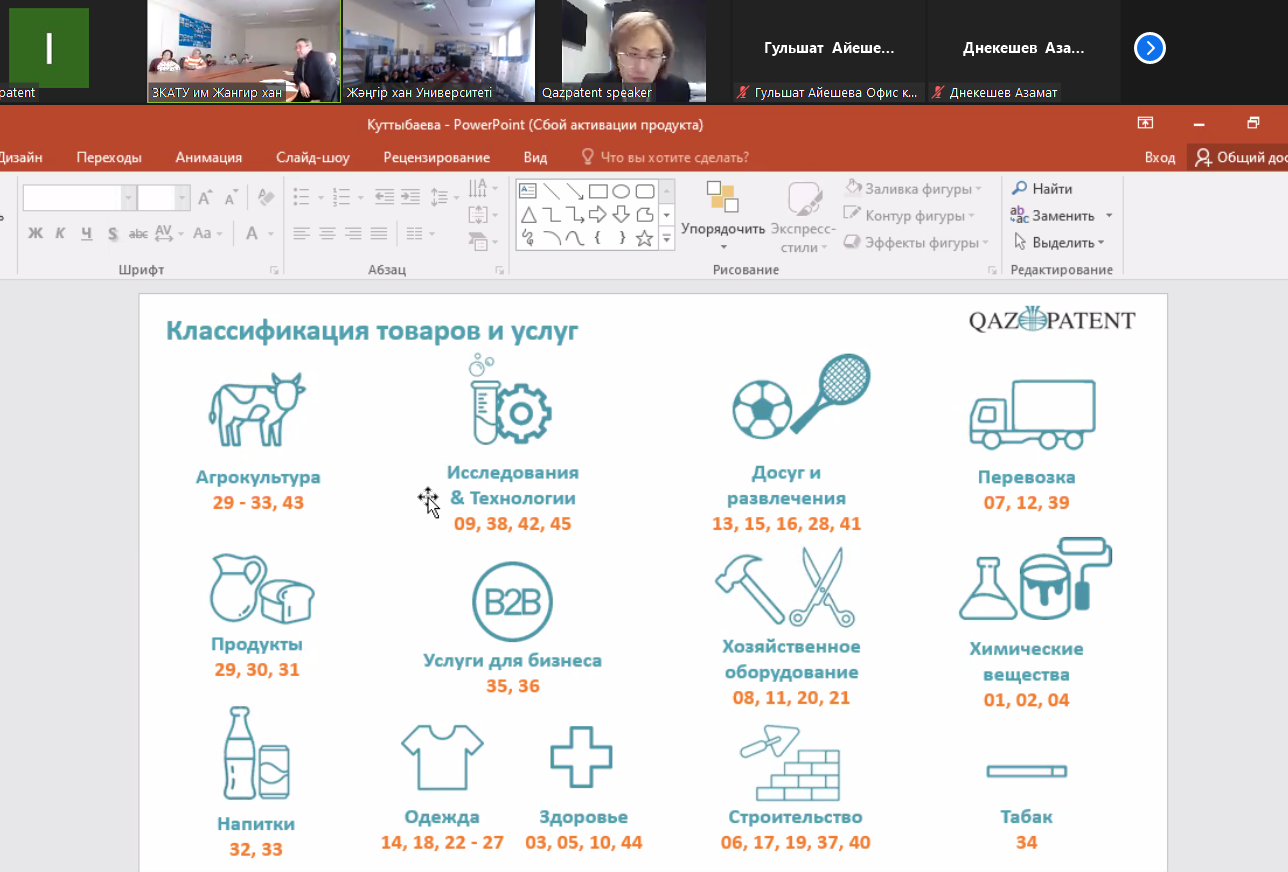 On April 2, Qazpatent held a webinar for the teaching stuff of Zhangir Khan University on the topic: "Legal aspects of intellectual property".