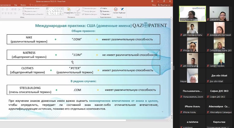 On June 7, Qazpatent hеld a training webinar for employees of the Agency of the Republic of Kazakhstan on Financial Monitoring and Departments of Justice on the topic: "Collision of domain names and firm names with trademarks".