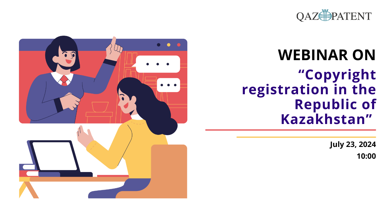 On July 23, at 10:00, Qazpatent will hold a joint webinar with the Department of Justice of Kostanay for members of the National Chamber of Entrepreneurs "Atameken" on the topic "Copyright registration in the Republic of Kazakhstan".