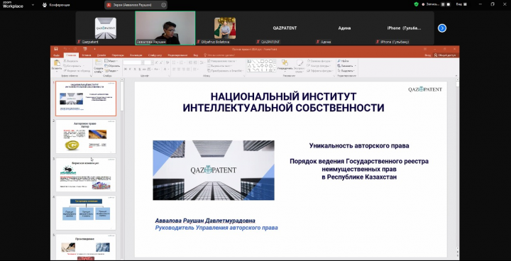 Within the framework of the webinar, issues of copyright registration in the Republic of Kazakhstan, patenting of inventions and utility models, trademark registration in the Republic of Kazakhstan, as well as commercialization of intellectual property objects were disclosed.