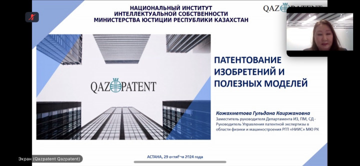 The webinars covered the concept and importance of intellectual property, copyright registration, legal protection of trademarks, international registration of trademarks under the Madrid system, patenting of inventions and utility models in the Republic of Kazakhstan, international patenting of inventions under the Patent Cooperation Treaty and regional patenting of inventions under the Eurasian Patent Convention, issues of legal protection of industrial designs in the Republic of Kazakhstan and under the Eurasian Patent Convention, legal protection of geographical indications and appellations of origin of goods, public services on industrial property objects and means of individualization, commercialization of intellectual property objects, as well as issues of intellectual property protection.