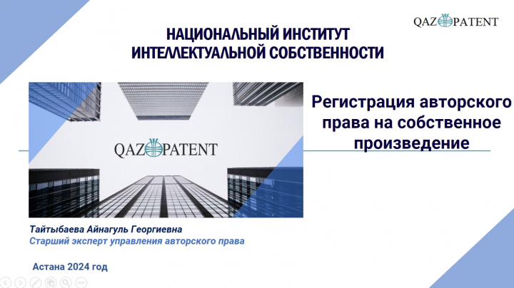 The webinar covered issues of copyright registration in the Republic of Kazakhstan, patenting of inventions and utility models, legal protection of industrial designs in the Republic of Kazakhstan, as well as the Eurasian system of Legal Protection of Industrial Designs.