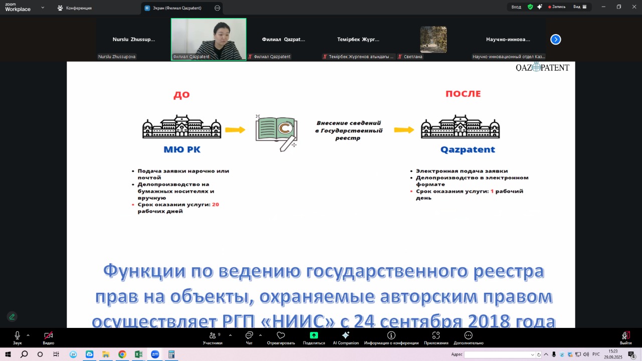 29 қыркүйекте Qazpatent филиалының қызметкерлері Темірбек Жүргенов атындағы Қазақ ұлттық өнер академиясның оқытушыларына арналған "өз туындысына авторлық құқықты тіркеу" тақырыбында онлайн-семинар өткізді.