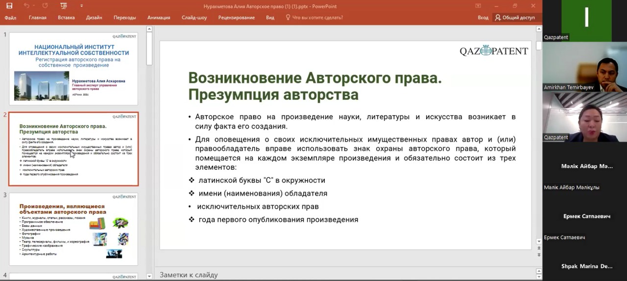 The webinar covered the topics of copyright in the Republic of Kazakhstan, the main forms of transfer of rights and tools for the protection of intellectual property rights.