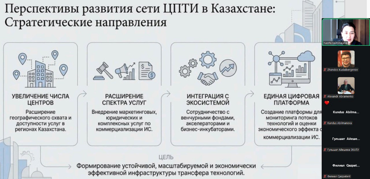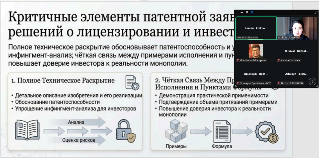 On 29 December 2025, the Republican State Enterprise “National Institute of Intellectual Property” (Kazpatent) held an online round table dedicated to the quality of patent application drafting as a key factor for successful technology transfer and innovation commercialization. The event was conducted in a hybrid format with the participation of representatives of the Technology and Innovation Support Centers (TISC) network, patent attorneys, universities, and research organizations.