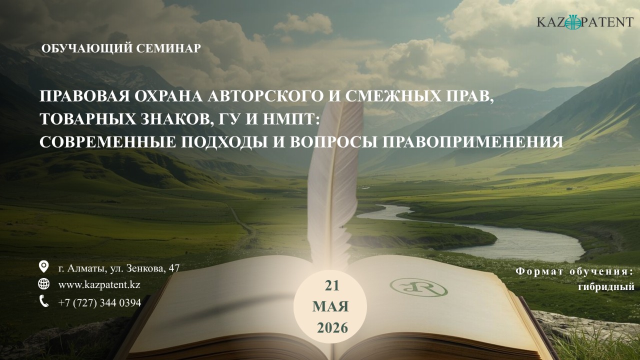 Kazpatent филиалы Сізді Қазақстан Республикасындағы авторлық құқық объектілерін, тауар белгілерін, географиялық нұсқамаларды және тауарлар шығарылған жерлердің атауларын құқықтық қорғау мәселелеріне арналған бір күндік оқыту семинарына қатысуға шақырады.