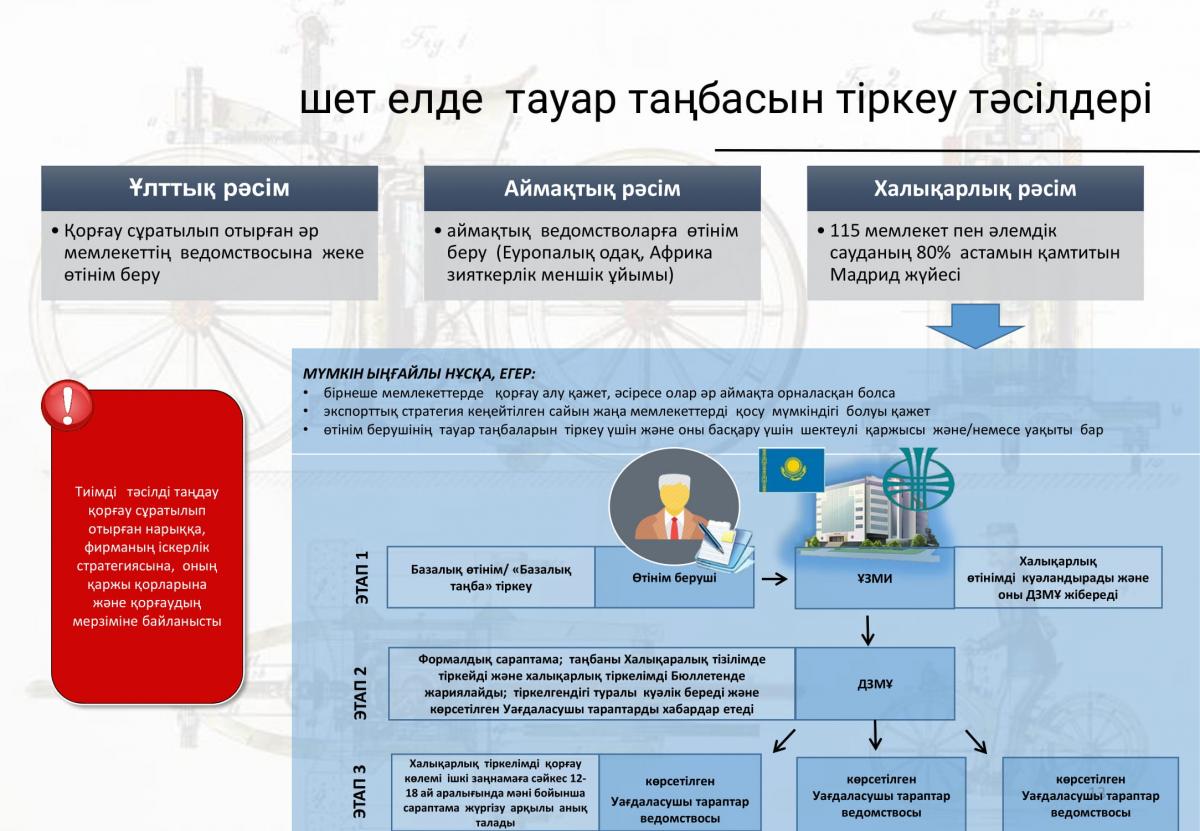 Тауар белгілерін халықаралық тіркеу туралы 1989 жылғы 27 маусымдағы Мадрид келісіміне Хаттамаға (бұдан әрі - Хаттама) сәйкес жүзеге асырылады. Хаттамада шыққан жер ведомствосына (Қазақстан Республикасында - «Ұлттық зияткерлік меншік институты» РМК) (бұдан әрі - ҰЗМИ) Хаттамаға қол қойған елдер және/немесе халықаралық ұйымдарға (бұдан әрі - елдер) сілтемені қамтитын халықаралық өтінім беру көзделеді. Мүшелердің актуальді тізімі Дүниежүзілік зияткерлік меншік ұйымының (бұдан әрі — ДЗМҰ) сайтында www.wipo.int/madrid/ru/members/ орналасқан. Халықаралық тіркеуден ойдағыдай өткен соң тауар белгісі халықаралық өтінімде көрсетілген елдерде өтінім осы елдердің ведомстволарына тікелей берілгендей тіркелген болып танылады.