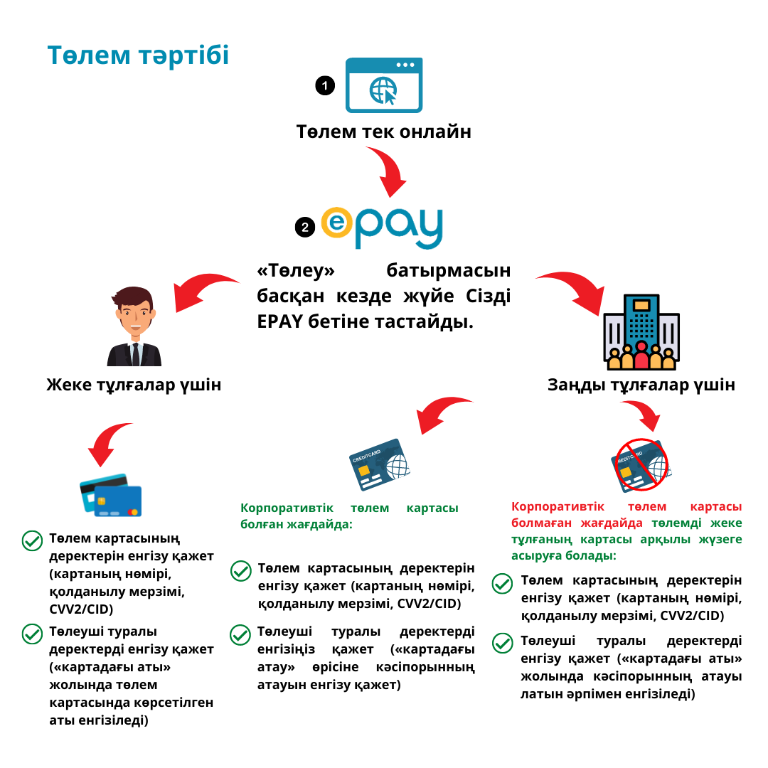 Төлемді жүзеге асыру үшін «Төлеу» батырмасын басу қажет. «Жаңа төлем» терезесінде тарифпен танысып, «Төлеу» батырмасын басу қажет. «Төлеу» батырмасын басқан кезде жүйе Сізді EPAY бетіне тастайды.