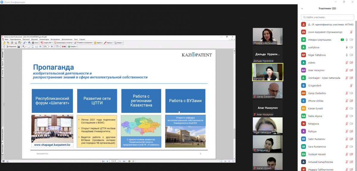 Бүгін, 2021 жылғы 29 қыркүйекте Әзірбайжан Республикасы зияткерлік меншік агенттігінің өкілдерімен тәжірибе алмасу бойынша алғашқы онлайн-тренинг өтті.