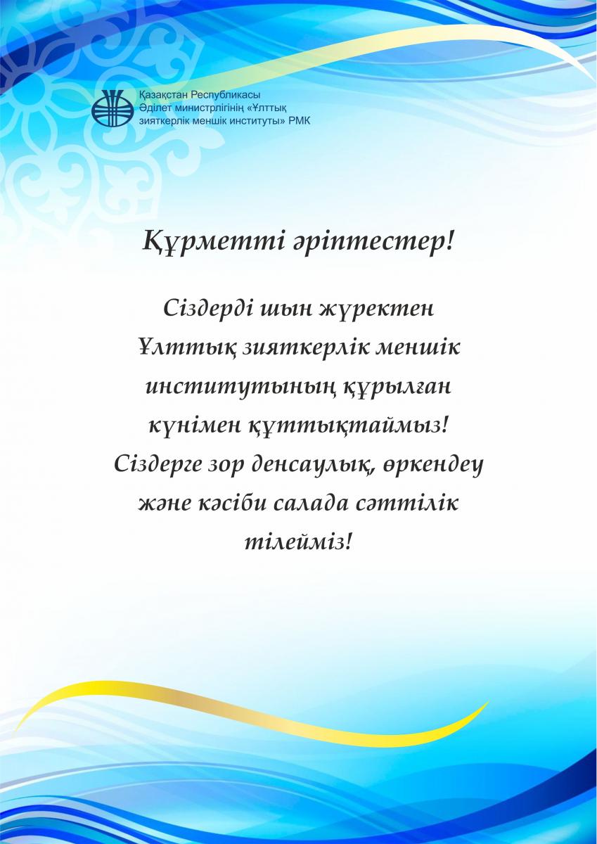 Құрметті әріптестер! Сіздерді шын жүректен Ұлттық зияткерлік меншік институтының құрылған күнімен құттықтаймыз! Сіздерге зор денсаулық, өркендеу және кәсіби салада сәттілік тілейміз!