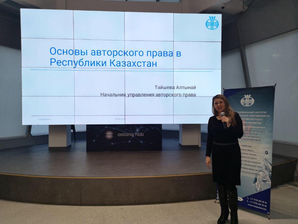 Келесі «Тауар таңбаларын және тауар шығарылған жердің атауларын заңды қорғау» тақырыбында «ҰЗМИ» РМК тауар таңбалары, тауар шығарылған жердің атаулары және өнеркәсіптік үлгілер департаментінің басшысы А. Казиева сөз сөйледі. Презентация барысында спикер тауар таңбаларын ұлттық және халықаралық дейгейде тіркеу бойынша жан-жақты ақпаратын ұсынды. «Өнеркәсіптік үлгілерді құқықтық қорғау» мәселесі бойынша өнеркәсіптік үлгілер басқармасының басшысы Л. Салкен сөйледі. «Қазақстандағы авторлық құқық» атты презентациясын авторлық құқық басқармасының басшысы А. Тайшева ұсынды. Ол өз сөзінде Қазақстандағы авторлық құқықтың негіздері туралы айтып өтті.