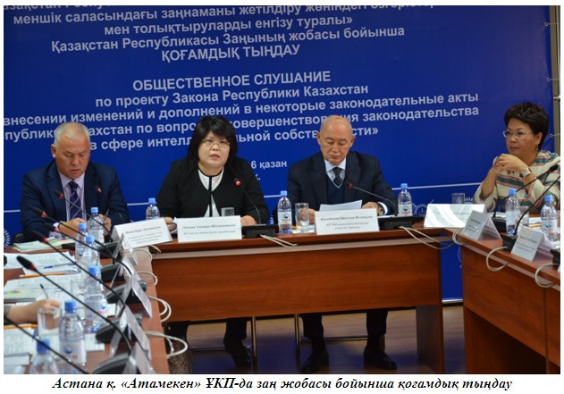 6 қазанда АстанадаҚР Әділет министрлігімен ұйымдастырылған «Қазақстан Республикасының кейбір заңнамалық актілеріне зияткерлік меншік cаласындағы заңнаманы жетілдіру мәселелері бойынша өзгерістер мен толықтырулар енгізу туралы» Қазақстан Республикасы Заңының жобасы бойынша қоғамдық тыңдау өтті.