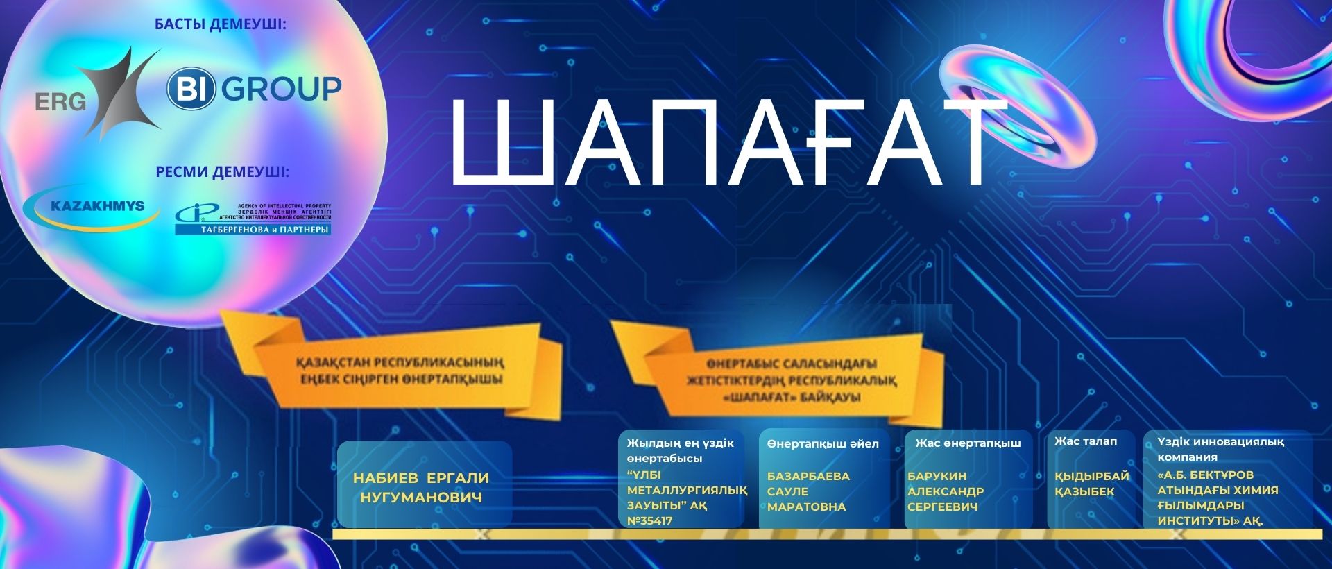 «Жыл өнертабысы» номинациясында - «Үлбі металлургия зауыты» АҚ, «Титан бериллидінен ірі габаритті дайындамалар мен бұйымдарды алу тәсілі» өнертабысына №35417 өнертабысқа патент иеленді. Авторлары: Колмаков М. Г., Ударцев С. В. Аринова и. в., Зорин б. л. Фоминов г. Ю., Вечкутов а. Н., Богачев в. а. ғылым саласы: металлургия;