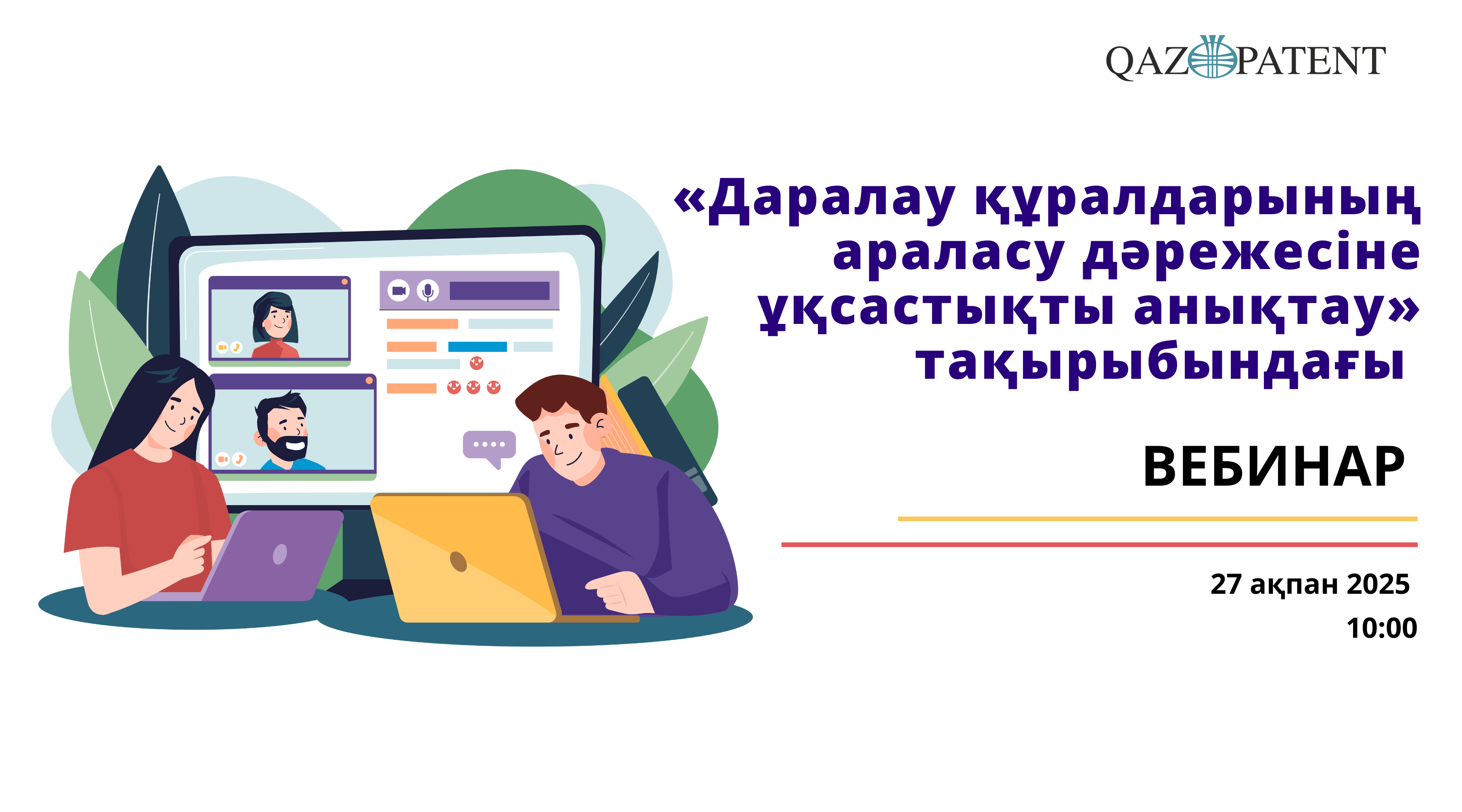 27 ақпанда сағат 10:00-де Qazpatent «Қазақстан Республикасы Әділет министрлігінің Сот сараптамалары орталығы» РМҚК қызметкерлері үшін «Даралау құралдарының араласу дәрежесіне ұқсастықты анықтау» тақырыбында вебинар өткізеді.
