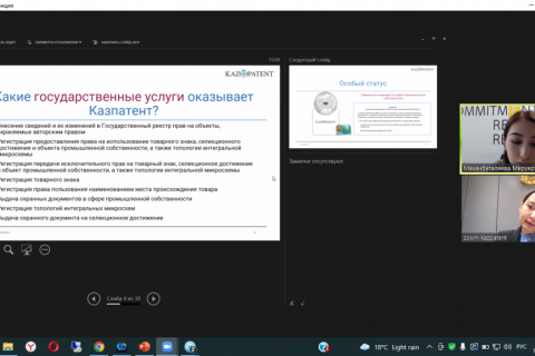 Алматы, Маңғыстау облыстарының кәсіпкерлеріне, Алматы қаласының Кәсіпкерлік палатасына үшін «Тауарлар шығарылған жердің атауын құқықтық қорғау» тақырыбындағы вебинар