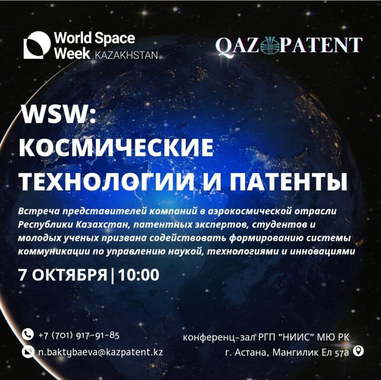 В рамках Всемирной недели космоса 7 октября РГП «Национальный институт интеллектуальной собственности» МЮ РК (Qazpatent) проводит встречу«World Space Week: Космические технологии и Патенты». Целью мероприятия является популяризация научно-технической и патентно-инновационной деятельности в космической отрасли нашей страны.