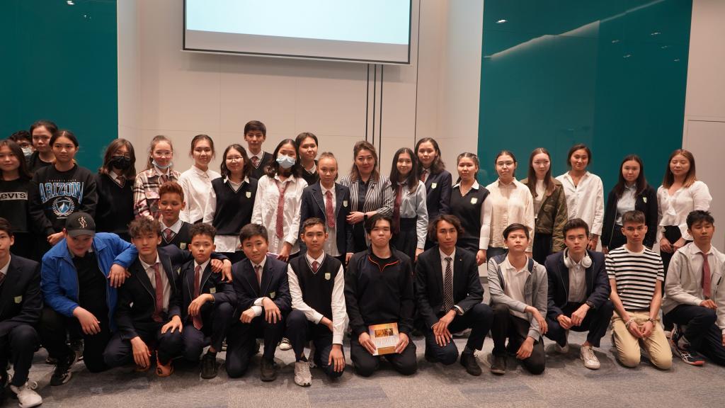 Мероприятие с участием школьников 8-11 классов началось с показа специального выпуска Агентства Хабар о конкурсе школьников: «Продолжение большого пути».