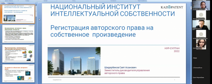 17 марта Kazpatent провел обучающий вебинар для профессорско-преподавательского состава и студентов Казахского национального исследовательского технического университета имени К. И. Сатпаева на тему: «Охрана и защита объектов интеллектуальной собственности».