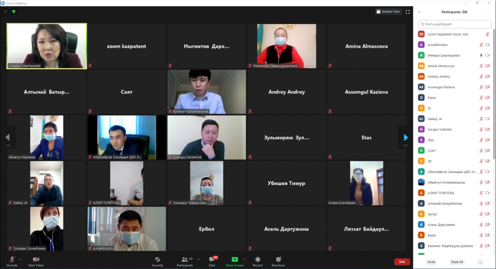26 ноября Kazpatent провел онлайн-вебинар по вопросам правовой охраны интеллектуальной собственности для сотрудников Отделов по правам интеллектуальной собственности при территориальных органах юстиции Актюбинской, Атырауской, Западно-Казахстанской и Мангистауской областей, а также представителей палат предпринимателей «Атамекен» и представители малого и среднего бизнеса.