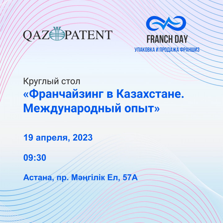 19 апреля 2023 года на площадке Qazpatent состоится круглый стол «Франчайзинг в Казахстане. Международный опыт» посвященный обсуждению практических методов и шагов по созданию казахстанского франчайзингового бизнес-сообщества с единой международной диалоговой площадкой, в том числе с точки зрения интеллектуальной собственности, науки, бизнеса и государства с целью развития франчайзинга, а также особенностях регистрации договоров франчайзинга в Казахстане.