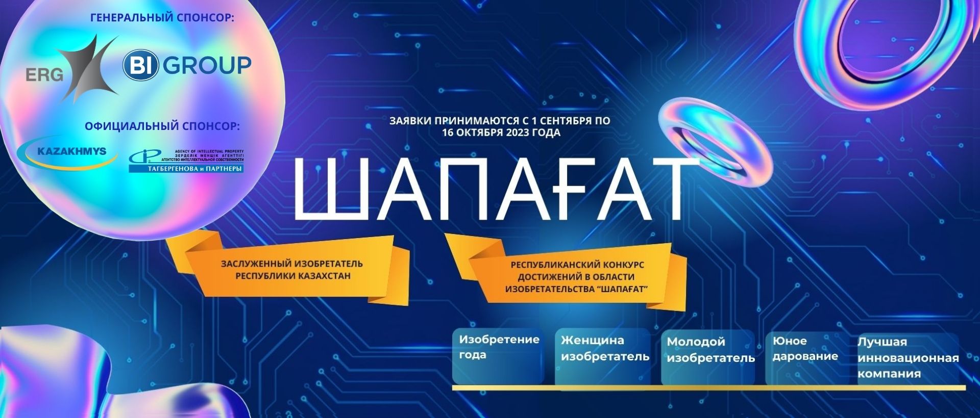 Заявки и ходатайства для участия в Конкурсе "Шапағат" и для присуждения почетного звания "Заслуженный изобретатель Республики Казахстан" принимаются с 1 сентября по 16 октября 2023 года по электронному адресу shapagat@kazpatent.kz.