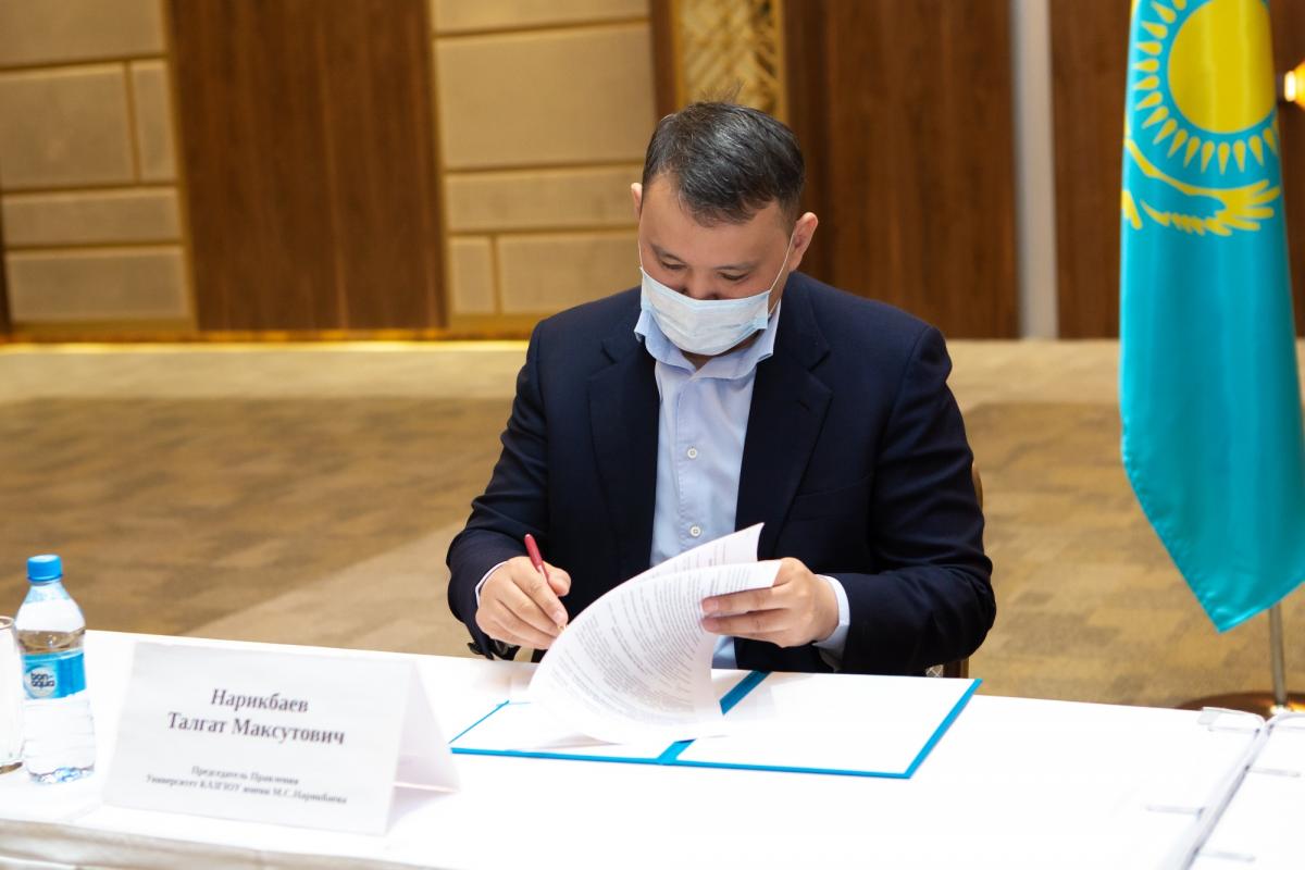 The document was signed by the Director of Kazpatent Yerbol Ospanov and Chairman of the Board of the M. Narikbayev KazGUU University Talgat Narikbayev.