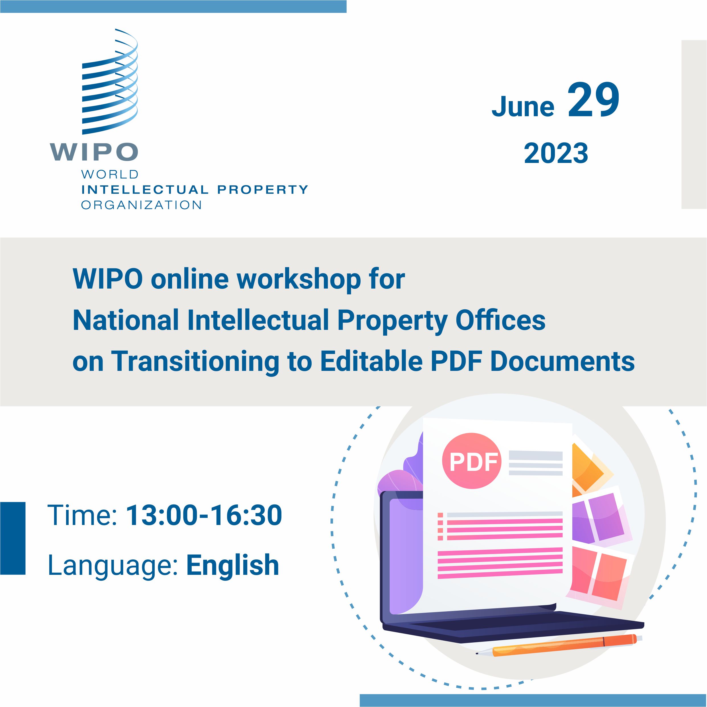 On June 29, 2023, an online workshop will be held for national intellectual property Offices, organized by the World Intellectual Property Organization in cooperation with the China National Intellectual Property Administration on the topic "Transitioning to Editable PDF Documents". A speaker from Qazpatent will participate on this online workshop on the topic "Insights from Member Offices Using Editable PDFs".
