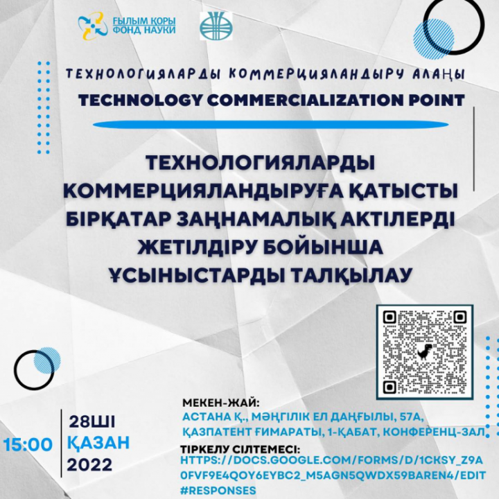 "Ұлттық зияткерлік меншік институты" РМК (бұдан әрі - ҚазПАТЕНТ) қабырғасында Технологияларды коммерцияландыру саласындағы заңнаманы жетілдіру жөніндегі ұсыныстарды талқылау үшін "Технологияларды коммерцияландыру алаңы" ("Technology Commercialization point") іс-шарасын өткізу жоспарлануда. Іс-шараның ұйымдастырушысы "Ғылым қоры"АҚ болып табылады.