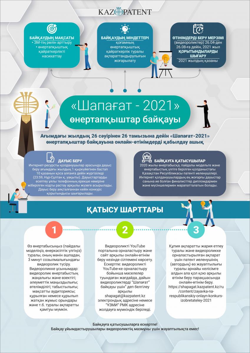Онлайн-өтінімді алдын ала құпия ақпаратты жарияламау және патент иеленушінің (автордың) өзінің видеороликте орналастырылған ақпарат үшін жауапкершілігі туралы арнайы келісімге қол қою арқылы конкурс бетінде беруге болады.