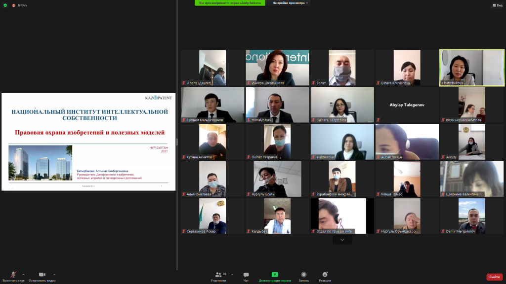 Вебинар барысында Қазпатент қызметкерлері өнеркәсіптік меншік объектілерін құқықтық қорғау, мемлекеттік тізілімдерді жүргізу, айрықша құқықтарға ие болу туралы шарттар жасасу, сондай-ақ Қазпатент құрамындағы IPR Center мүмкіндіктері мәселелері қамтылды.