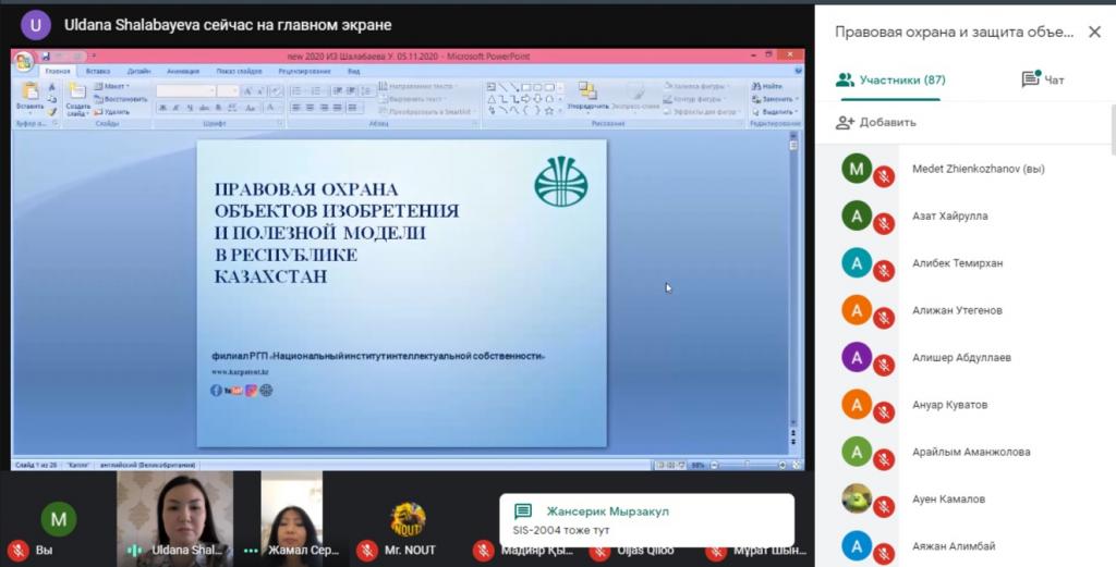2020 жылдың 5, 6 қарашасында «ҰЗМИ» РМК филиалының Оқу орталығы Халықаралық ақпараттық технологиялар университеті (ХАТУ) студенттеріне арналған «Зияткерлік меншік объектілерін құқықтық қорғау және сақтау» тақырыбында вебинар өткізді.