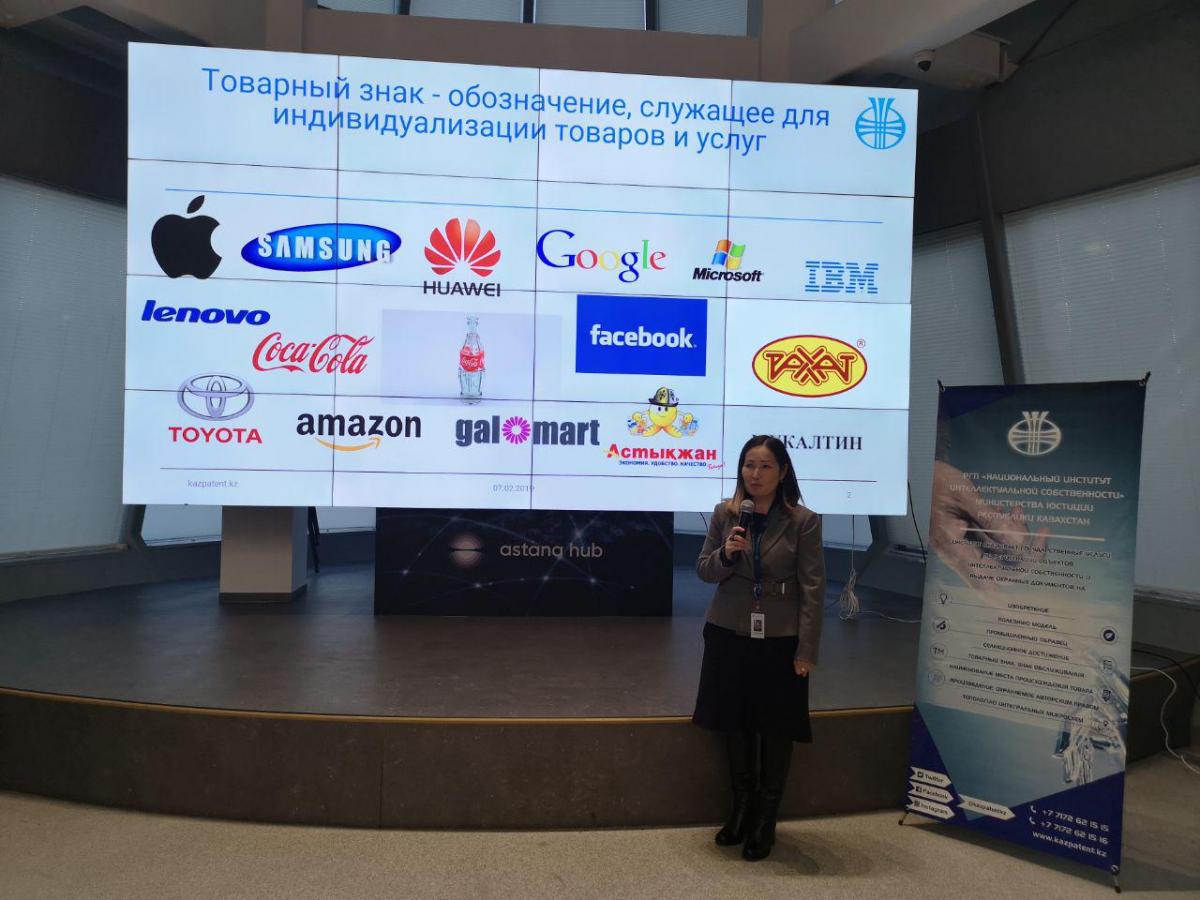 Келесі «Тауар таңбаларын және тауар шығарылған жердің атауларын заңды қорғау» тақырыбында «ҰЗМИ» РМК тауар таңбалары, тауар шығарылған жердің атаулары және өнеркәсіптік үлгілер департаментінің басшысы А. Казиева сөз сөйледі. Презентация барысында спикер тауар таңбаларын ұлттық және халықаралық дейгейде тіркеу бойынша жан-жақты ақпаратын ұсынды. «Өнеркәсіптік үлгілерді құқықтық қорғау» мәселесі бойынша өнеркәсіптік үлгілер басқармасының басшысы Л. Салкен сөйледі. «Қазақстандағы авторлық құқық» атты презентациясын авторлық құқық басқармасының басшысы А. Тайшева ұсынды. Ол өз сөзінде Қазақстандағы авторлық құқықтың негіздері туралы айтып өтті.