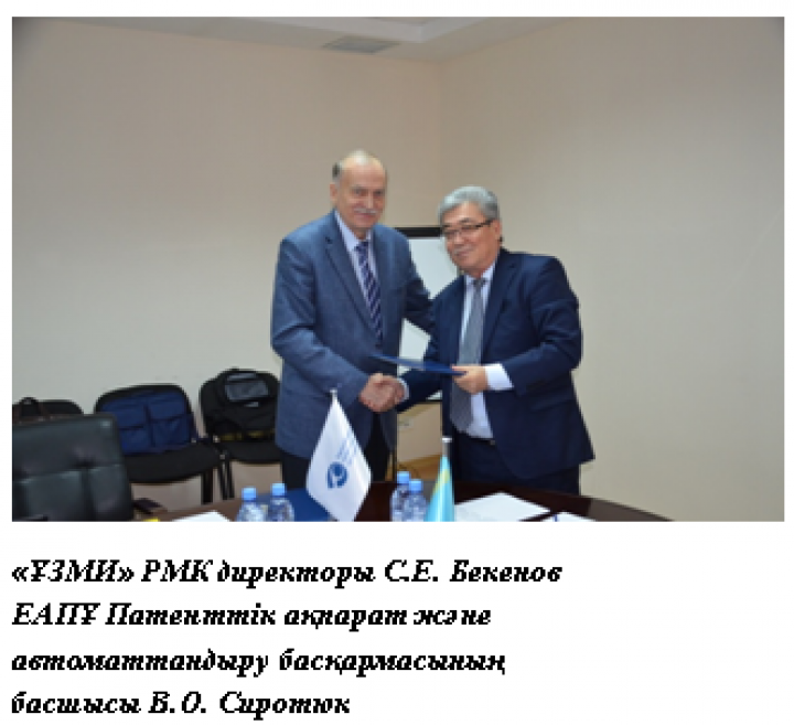 талқылау мақсатында 2015 жылдың 7 желтоқсанында ЕАПҰ және «ҰЗМИ» РМК арасындағы Автоматтандыру және ақпараттандыру бағдарламасына қол қойылды және ЕАПҰ Патенттік ақпарат және автоматтандыру басқармасының басшысы В.О.Сиротюк және ЕАПҰ Қағазсыз ақпараттық құралдарын дамыту тобының басшысы Е.Г.Тюринбасшылық етуімен ЕАПҰ делегациясымен кездесу өтті.Ынтымақтастық бағдарламасына сәйкес«ҰЗМИ» РМК редакциялық қызметі үшін макростарды бағдарламалық қамтамасыз етуді орнату, сонымен қатар патенттік құжаттарысипаттамаларының мәтіндерін формалдытексеру және түзету үшінмакростардыпайдалану бойынша «ҰЗМИ» РМКқызметкерлерін оқыту.Сонымен қатар, ұлттық патенттік ұйымы арқылы электрондық өтінім берудің альтернативті нұсқасын талқылауы жоспарлануда.