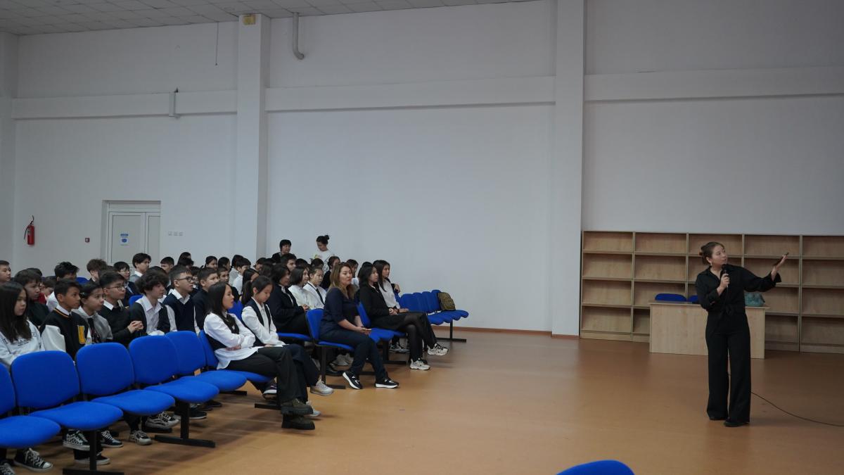 Оқушылар алдында зияткерлік меншік құқығы орталығының (IPR Center) басшысы Алтын Сапарғали және даму және халықаралық ынтымақтастық басқармасының басшысы Инкара Шертышева сөз сөйледі.