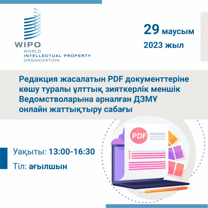 2023 жылғы 29 маусымда ұлттық зияткерлік меншік Ведомстволарына арналған Дүниежүзілік зияткерлік меншік ұйымының ұйымдастыруымен және Қытай ұлттық зияткерлік меншік администрациясының ынтымақтастығымен "Редакция жасалатын PDF документтеріне көшу" тақырыбында онлайн жаттықтыру сабағы өтеді. Онлайн жаттықтыру сабағында "Редакция жасалатын PDF-терді қолданатын Мүше ведомстволардың инсайттары" тақырыбында Казпатент тарабынан спикер қатысатын болады.