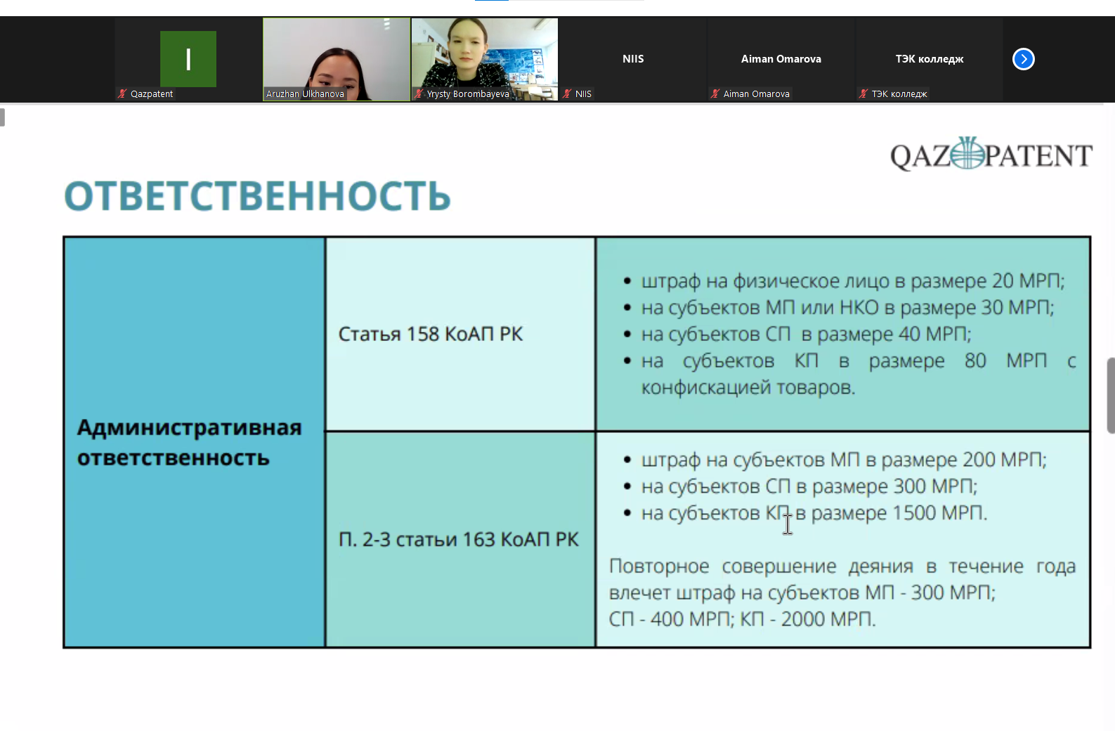 8 қарашада Qazpatent Павлодар техникалық-экономикалық колледжінің және басқа колледждердің профессор-оқытушылар құрамына, «Білім беру анимациялық бейне контентін құру негіздері» курсының түлектеріне арналған «Зияткерлік меншіктің құқықтық аспектілері» тақырыбында вебинар өткізді.