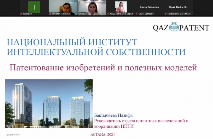 Вебинар аясында зияткерлік меншік ұғымы мен маңыздылығы мәселелері, авторлық құқық және оны Қазақстан Республикасында тіркеуі, сондай-ақ өнертабыстар мен пайдалы модельдерді патенттеу тақырыбы ашылды.
