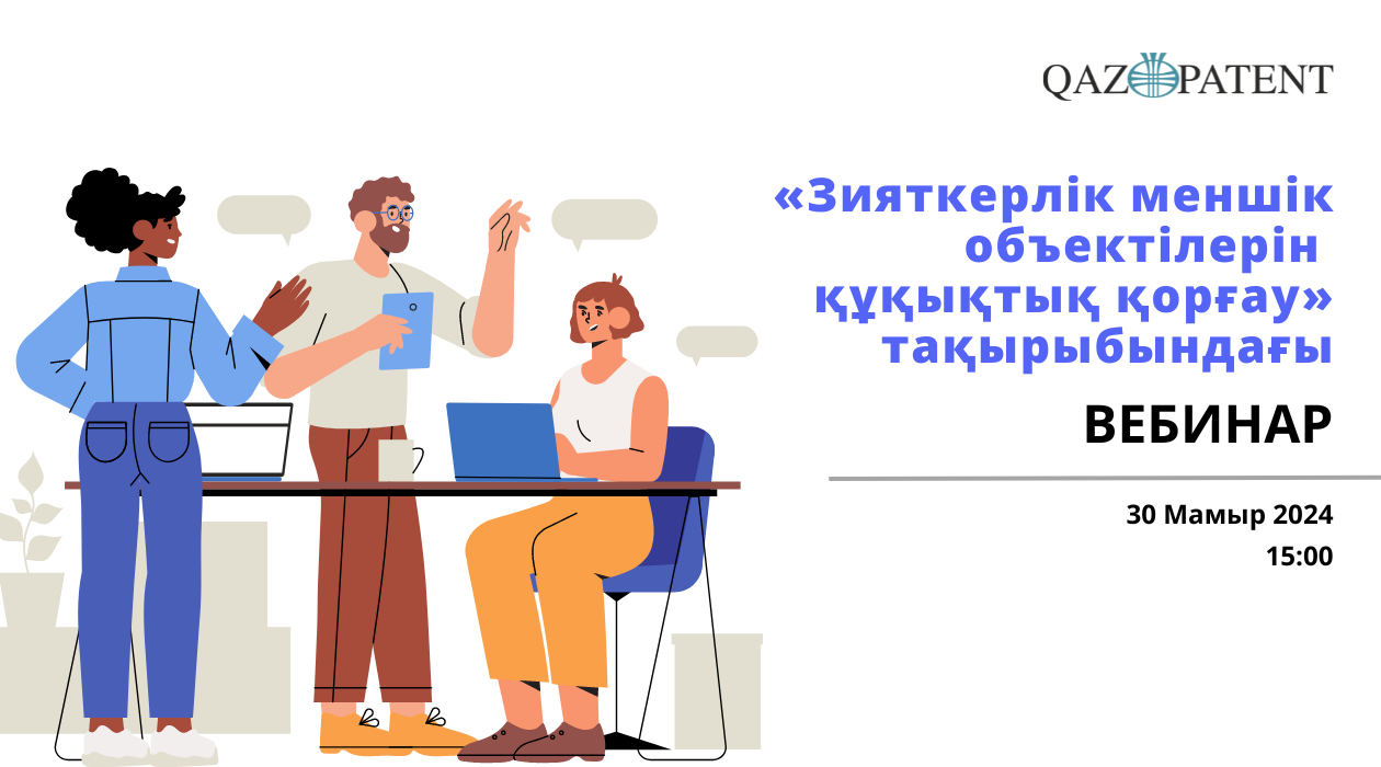 30 мамырда сағат 15:00-де Qazpatent әл-Фараби атындағы Қазақ Ұлттық Университетінің студенттеріне, қызметкерлеріне және профессор-оқытушылар құрамына үшін «Зияткерлік меншік объектілерін құқықтық қорғау» тақырыбында вебинар өткізеді.
