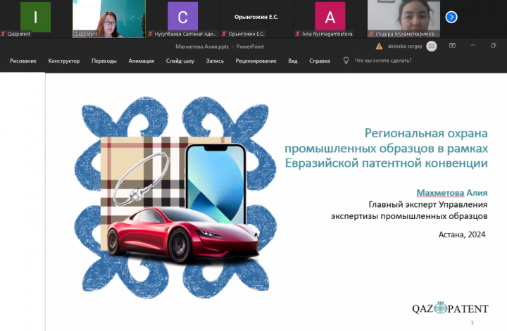 Вебинар аясында өнеркәсіптік үлгілердің құқықтық қорғаудың Еуразиялық жүйесі, тауар белгілерін халықаралық тіркеуге өтінімді ресімдеу, тауар белгілеріне өтінімдерді беруге қойылатын талаптар, Қазақстан Республикасында тауар белгілерін құқықтық қорғау, Қазақстан Республикасында тауарлар шығарылған жерлердің географиялық нұсқамалар мен атауларын құқықтық қорғау, сондай-ақ зияткерлік меншікті қорғау мәселелері ашылды.
